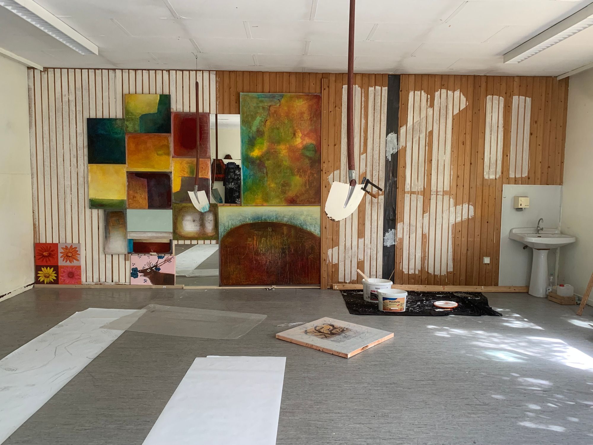 Zur Zeit befinden sich meine Atelierräume auf der Liegenschaft Erlenweg 2, im Wiesbadener Stadtteil Biebrich. Ich nutze bis zum Ende September 2023 die Pavillions ( 6 Räume) der ehemaligen Kita Villa Kunterbunt. Dann wird u.a. auf dem Gelände der ehemaligen Kita der Sportpark Rheinhöhe mit einem Hallenbad und einer Eissporthalle errichtet.
